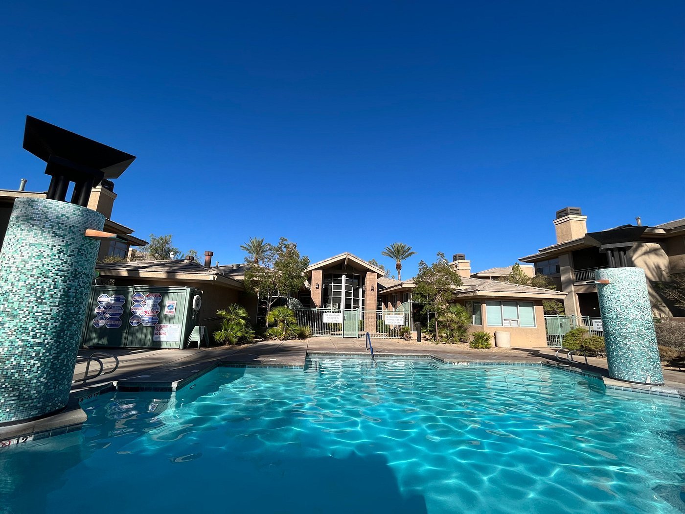 The resort grounds are beautifully maintained, featuring an inviting heated outdoor pool surrounded by lounge chairs and palm trees, a whirlpool spa ideal for unwinding after a day of sightseeing, and a fully equipped fitness center for those who want to stay active. A charming clubhouse offers additional space to relax, complete with a fireplace, seating areas, and planned activities throughout the week. Outdoor grilling stations and picnic areas make it easy to enjoy meals with family and friends under the Nevada sky.