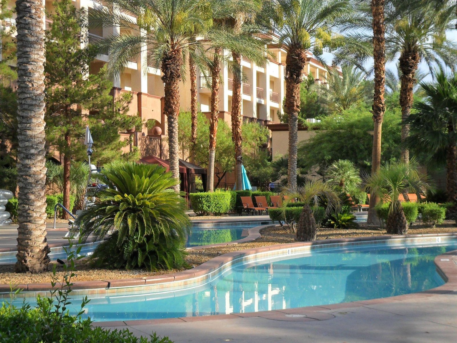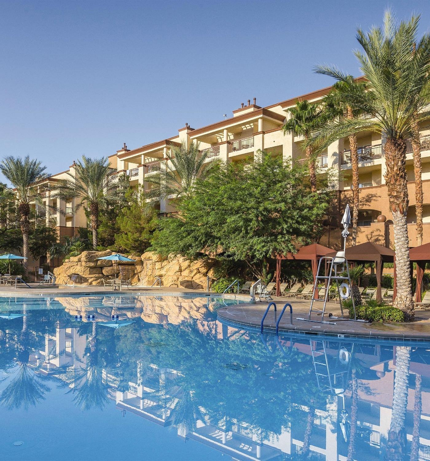 WorldMark Las Vegas – Boulevard offers a vibrant escape just minutes from the dazzling energy of the Las Vegas Strip while still providing a relaxing retreat from the nonstop excitement of the city. Designed with a laid-back desert oasis feel, this resort blends modern comfort with tropical touches — palm trees swaying by the lagoon-style pools, colorful cabanas, and fountains that create a peaceful backdrop under the Nevada sun.